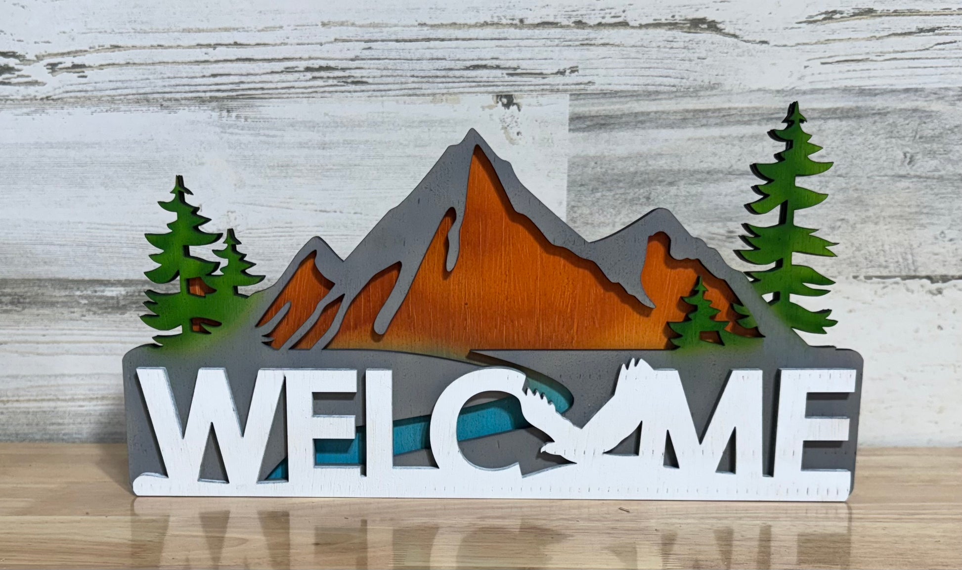 Welcome sign, trees and mountains. Gray, green, brown, blue, and whiten wood layered sign.